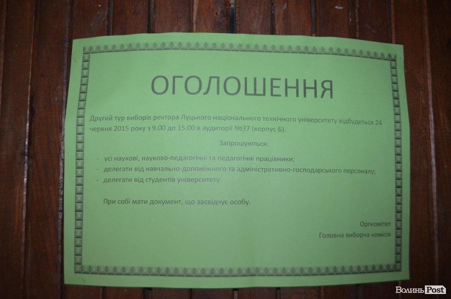 До другу туру виборів ректора ЛНТУ пройшло два кандидати: депутат Луцької міської ради Петро Савчук і донька екс-ректора університету Зоряна Герасимчук, які набрали найбільше голосів у першому турі голосування.