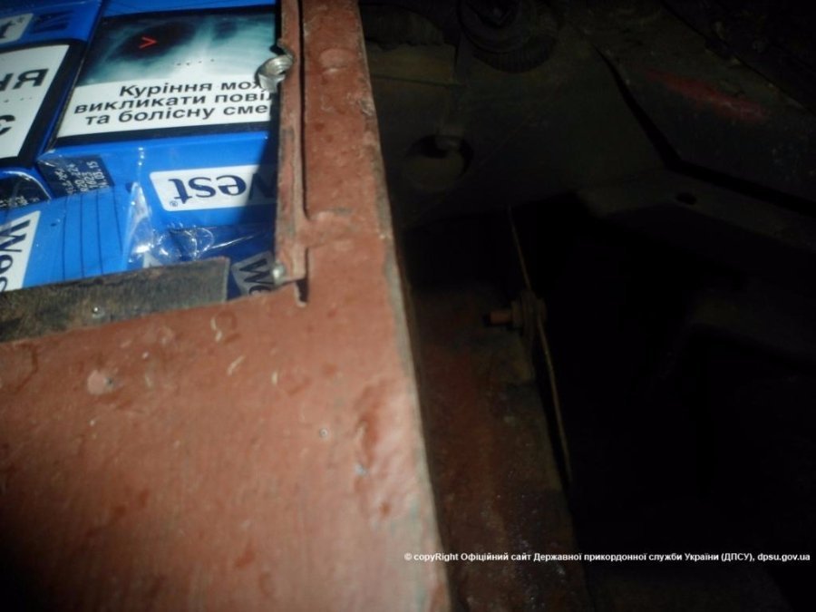 Всього у спеціально виготовленому тайнику, у ящику для інструментів, в порогах, під килимками та під сидіннями автомобіля було виявлено 1210 пачок сигарет.
