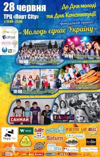 З нагоди Дня молоді та Дня Конституції України у місті Луцьку відбудеться громадська програма "Молодь єднає Україну". Захід відбудеться 28 червня біля ТРЦ "Порт Сіті". Початок о 13:30.