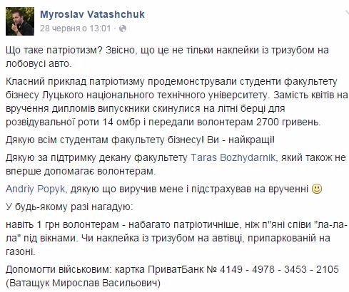“Класний приклад патріотизму продемонстрували студенти факультету бізнесу Луцького національного технічного університету. Замість квітів на вручення дипломів випускники скинулися на літні берці для розвідувальної роти 14 омбр і передали волонтерам 2700 гривень”, – повідомив він.