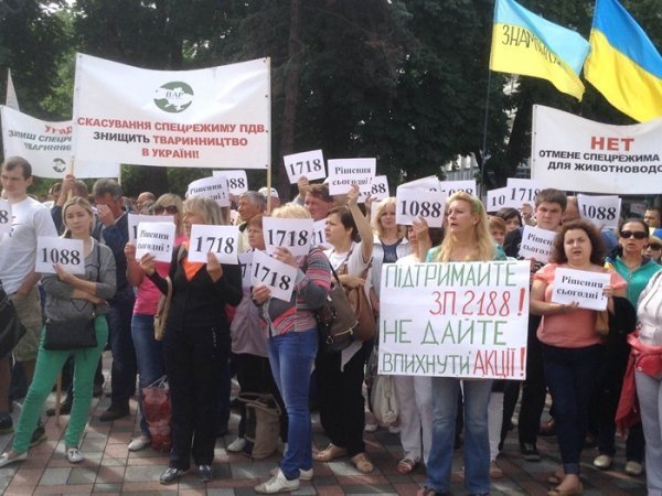 Окрім того, деякі активісти тримають у руках плакати з надписами: «ПДВ уб'є тваринництво!», «Ні - відміні спецрежиму ПДВ для тваринництва!» тощо.