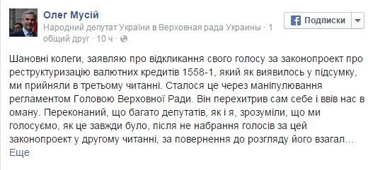 "Ми проголосували за муніципальну міліцію, а Радикальна партія почала вимагати ухвалення законопроекту 1558. Через переполох у залі Верховної Ради та втому більшість депутатів просто не зрозуміли, що відбувається... Ми зробили величезну помилку - проголосували за цей законопроект. Це катастрофа! Особисто я думав, що голосую за його повернення на доопрацювання! Через цей законопроект на Україну чекає дефолт. Це знищення економіки! Через людей, які не захотіли ризикувати і брати кредит у гривні, а взяли у валюті, постраждають усі українці. Я помилився і одразу відкликав свій голос", - зазначив представник "Блоку Петра Порошенка" Борислав Розенблат.
