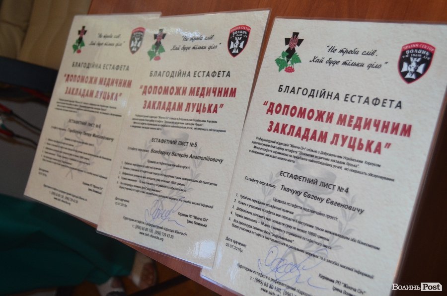 3 липня депутат Луцької міської ради Володимир Никитюк привіз у Волинську обласну інфекційну лікарню новий інфузомат. Заявку на придбання цього апарату, разом з естафетою він отримав від організацій РП «Жіноча Січ» і ДУК «Правий Сектор», які й організували цей благодійний марафон.