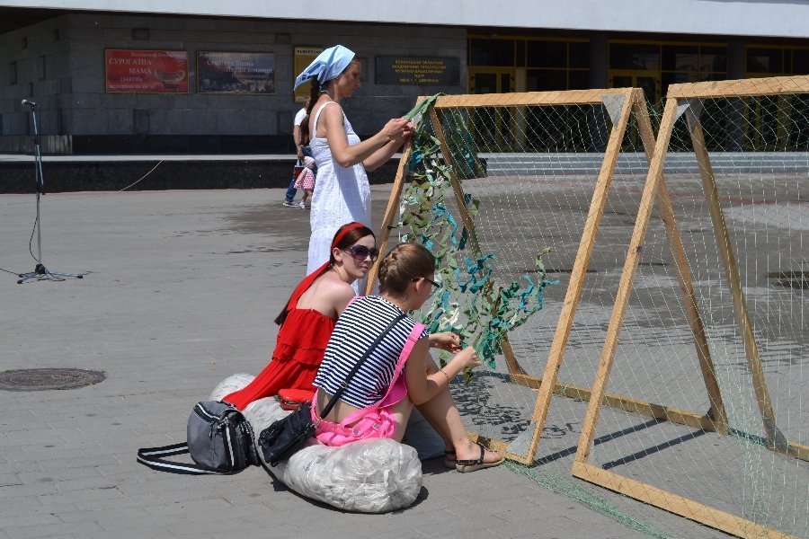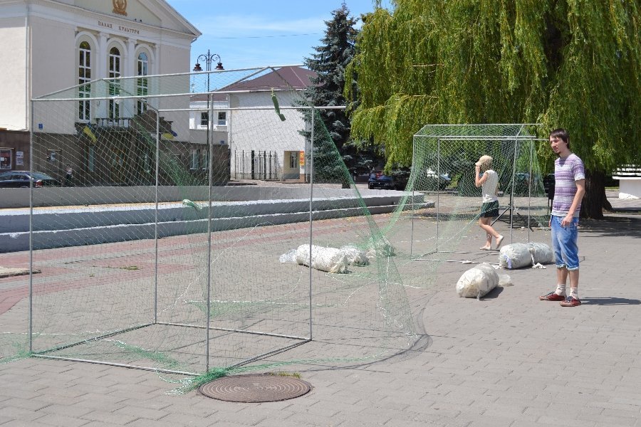 «Часто вчителі чи викладачі змушують студентів і учнів плести сітки. Та влітку усі університети та школи закриті. От ми плетемо тут – на Театральному майдані, і хочемо перевірити, скільки лучан схочуть виділити 10 хвилин і зробити корисну справу», – розповідає громадський активіст Володимир Бут-Гусаїм.