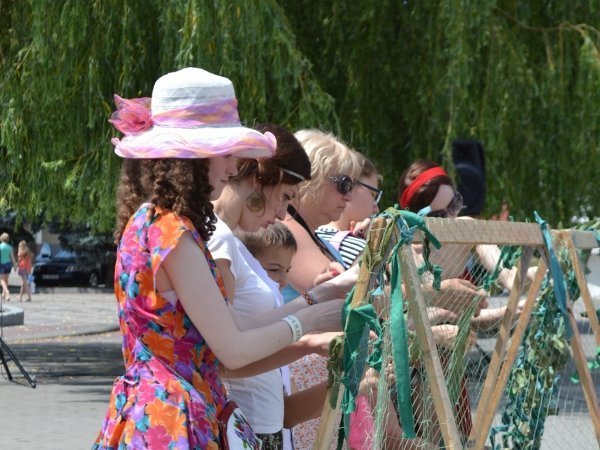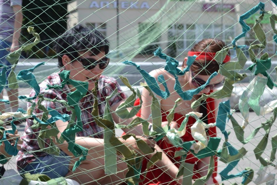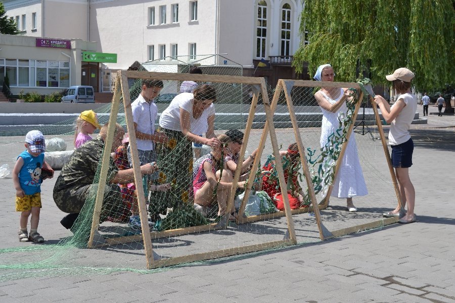 У центрі Луцька всі охочі плетуть маскувальні сітки. ФОТО
