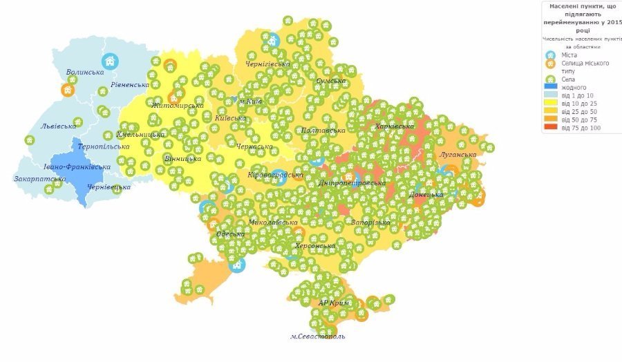 Лідерами за кількістю населених пунктів, що треба перейменувати, виявились Донецька та Луганська області.
