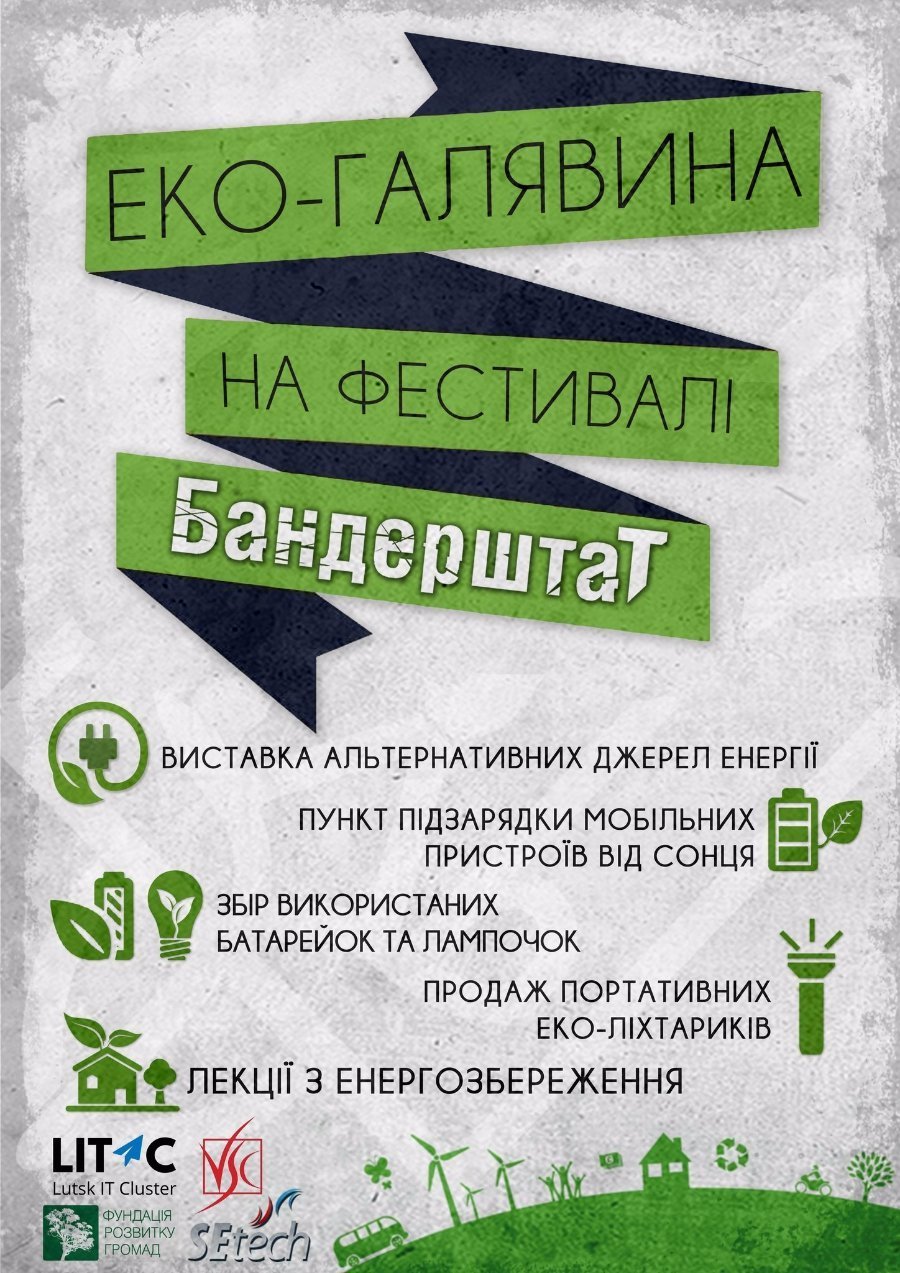 Аби популяризувати альтернативні джерела енергії та донести до людей інформацію про зелений тариф “Фундація Розвитку Громад” за підтримки Луцького ІТ-кластеру представить на території фестивалю “Бандерштат 2015” зелену зону, де можна буде не тільки підзарядити мобільні пристрої та гаджети від сонячної енергії, а й відпочити та стати учасником бесід на тему енергозбереження.