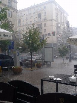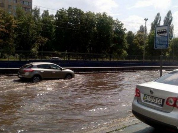 У Києві пройшла дуже сильна злива. За словами очевидців, за 10-15 хвилин дощ повністю залив дороги на Борщагівці. Зокрема, затоплена ділянка дороги по проспекті Леся Курбаса між зупинками "Сім'ї Сосніних" і "Гната Юри".