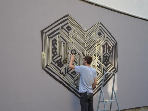 Максим ТікТак з Одеси малює геометричне серце, у якому зашифроване слово Луцьк. Графіті розміщене на вулиці Крилова, 4.