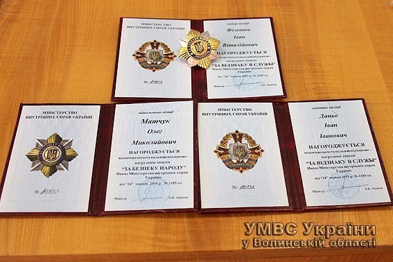 Відповідно до наказу МВС України, нагрудний знак «За безпеку народу» отримав оперуповноважений відділу боротьби з незаконним обігом наркотиків УМВС України у Волинській області підполковник міліції Олег Матчук. Старший слідчий слідчого управління УМВС України у Волинській області капітан міліції Іван Дацьо та заступник начальника слідчого відділення Луцького РВ майор міліції Іван Філонюк нагороджені нагрудними знаками «За візнаку в службі».