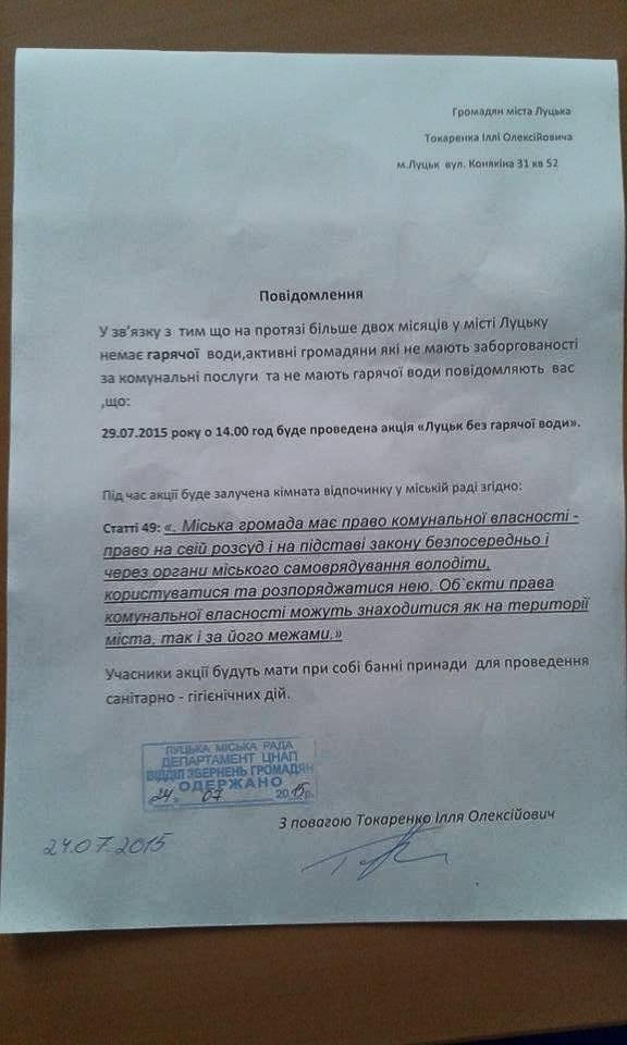 «У зв'язку з тим, що більше ніж два місяці в Луцьку немає гарячої води, активні громадяни, які не мають заборгованості за комунальні послуги та не мають гарячої води, повідомляють вас, що 29.07.2015 о 14:00 буде проведено акцію «Луцьк без гарячої води». Під час акції буде залучено кімнату відпочинку в міській раді», – сказано в повідомленні.