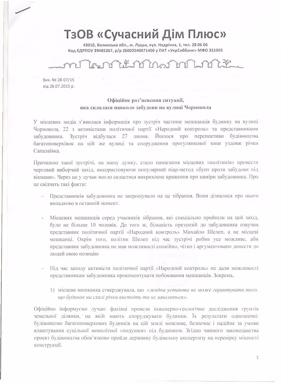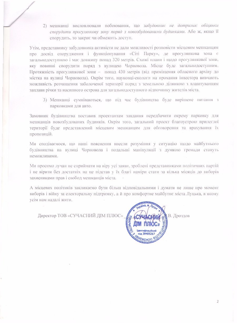 Ми сподіваємося, що наші пояснення внесли розуміння у ситуацію щодо майбутнього будівництва на вулиці Чорновола і подальші маніпуляції з думкою громади стануть неможливими.
