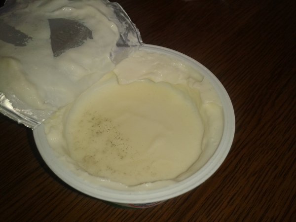 Оскільки "заморити черв'ячка" булочкою нам не вдалося, то йдемо у супермаркет навпроти. Булочок більше не хотілося, але неприємний присмак від котлет хотілося перебити хоча б чимось. Вирішуємо купити сирковий йогурт у супермаркеті "Салют". І тут доля "дарує" нам акцію: два таких десерти за ціною одного! Вже тепер заради цікавості хотілося поглянути всередину. Дата кінцевого терміну споживання: 31.07.2015 в обох. Не "свіжачок", але мали б бути ще придатні для споживання. Купуємо і йдемо на ту ж лавочку. Відкриваємо один: все добре. Наче й заспокоїлися. Відкриваємо інший - і ось Ваш бонус, оздоблений таким собі "пушком"!