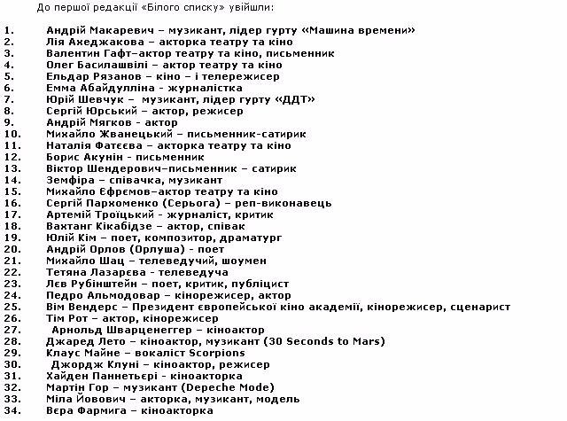 У переліку є імена російських музикантів, акторів, режисерів та інших діячів, які виступили на підтримку України в умовах російської агресії. Зокрема у списку Андрєй Макарєвіч, Лія Ахєджакова, Міхаіл Жванєцкій, Зємфіра та інші.