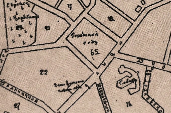 Новенький міський сад увійшов на тогочасну карту міста. Біля собору квадратна ділянка підписана як «Городской садъ».