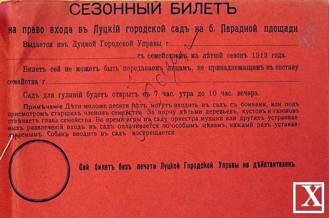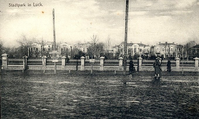 «Устроенный на бывшей Парадной площади городской садъ, со времени его устройства съ 1908 по 1913 г. оставался закрытымъ для публики. Въ 1913 г., уступая усиленнымъ ходатайствамъ жителей г. Луцка, Городская Дума постановленіемъ отъ 15 марта 1913 г. признала возможнымъ открыть садъ для посѣщенія его публикой, причемъ установила плату за сезонный билетъ съ семейства по 1 руб. и съ лицъ, не взявшихъ такового билета, по 5 копъ. съ человѣка за входъ».