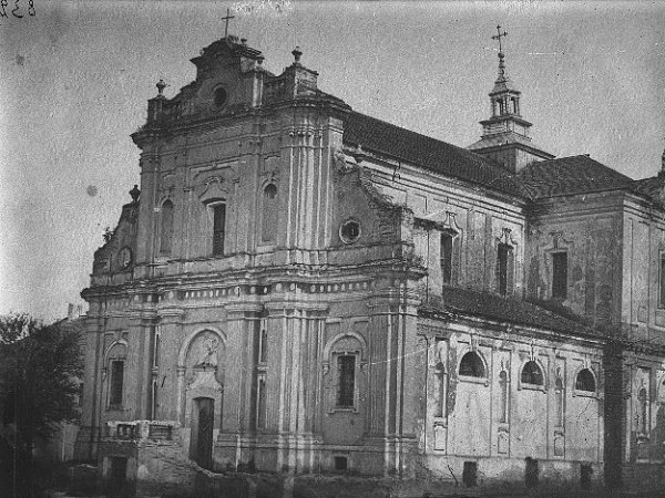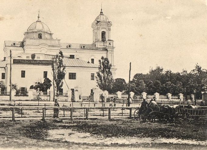 А це зображення собору 1901 року видавництва С. Бонка. На передньому плані – дерев’яні конструкції ринку. А навчальний заклад був тоді шестикласною прогімназією. Так підписана листівка. З лівого краю кадру виїжджає візник.