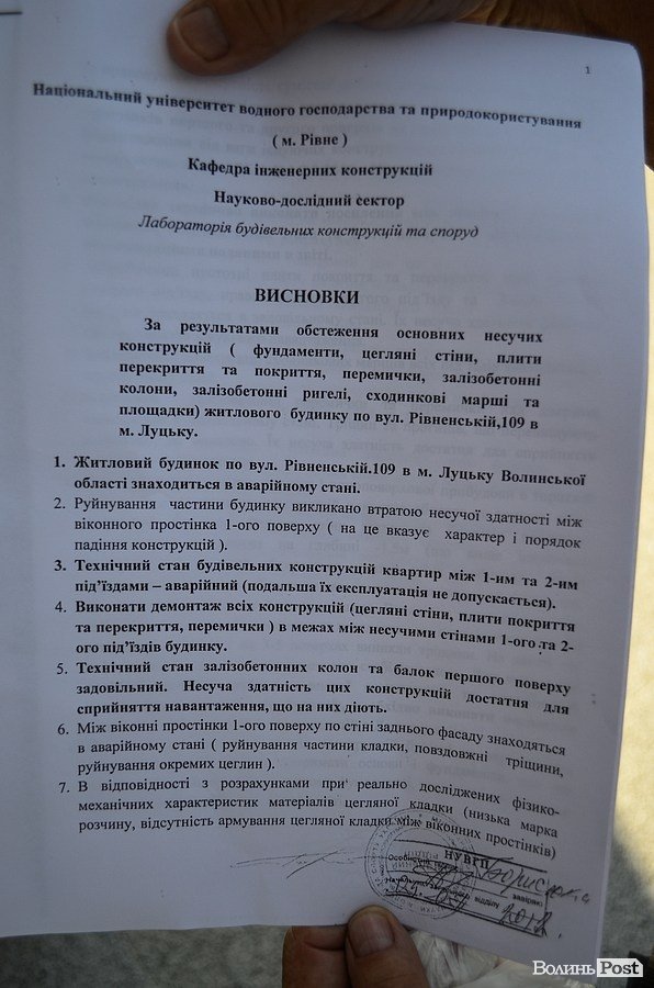 Жителям обваленого будинку у Луцьку на вулиці Рівненській , 109 вручили висновки результатів експертного обстеження їх будинку.