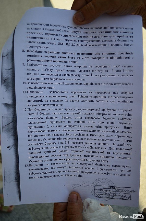 У висновку йдеться, що будинок знаходиться в аварійному стані. Не дозволяється подальша експлуатація квартир між 1 та 2 під'їздами.