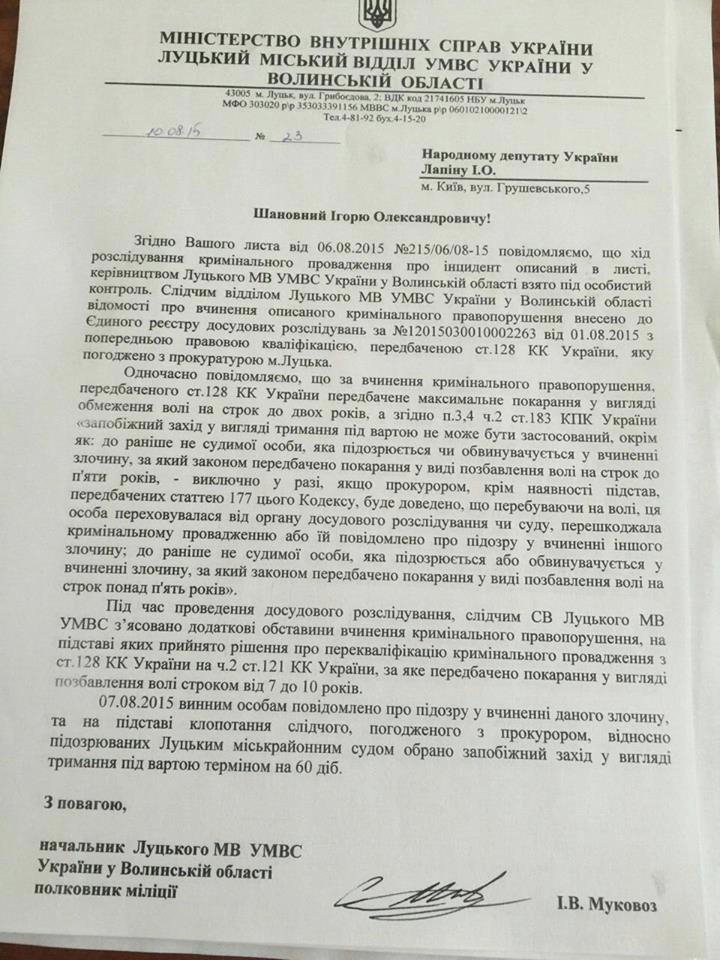 Нардеп Ігор Лапін отримав відповідь від начальника Луцького відділу міліції полковника Ігоря Муковоза у справі щодо побиття лучанина.