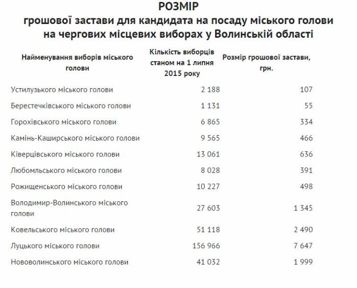 Нагадаємо, що згідно із законом «Про місцеві вибори» грошова застава вноситься на спеціальний рахунок територіальної виборчої комісії місцевою організацією партії, яка висунула виборчий список кандидатів у депутати в багатомандатному виборчому окрузі, кандидата на посаду міського голови, а також особою, яка висувається кандидатом на посаду міського голови шляхом само висування. Грошова застава є пропорційною до кількості виборців відповідних області, району, міста та визначається: