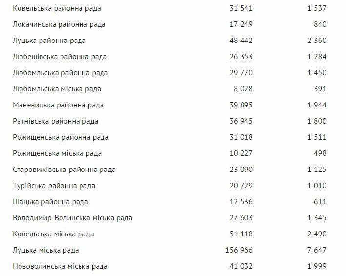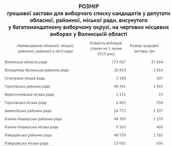 Найбільшу на Волині суму застави визначено для списків партій до Волинської обласної ради – понад 37 тис. гривень, найменшу до Берестечківської міської ради – всього 55 гривень. Сума грошової застави до Луцької міської ради становить 7647 гривень.