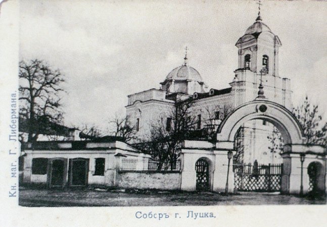 Собор на поштовій листівці Герша Лібермана. Вхідні ворота брами ще дерев'яні. Зображення з книги «Луцьк у старовинній листівці, гравюрі та фотографії» Віктора Літевчука
