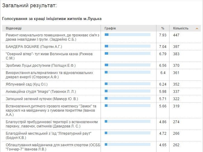 Із запропонованих ідей комісія міськради відібрала п'ятдесят, тепер - черга за жителями Луцька, які можуть проголосувати за три найвдаліших, на їх думку, ініціативи. Віддати свої голоси за вподобану ініціативу можна на офіційному сайті Луцької міської ради до 24 серпня включно.