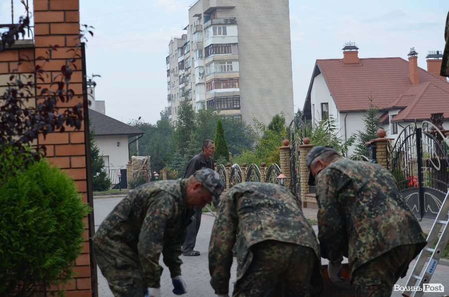 Представники Волинського обласного об'єднання ветеранів АТО та волонтерів по цеглині розбирають огорожу депутата Луцької міської ради Валерія Бондарука.