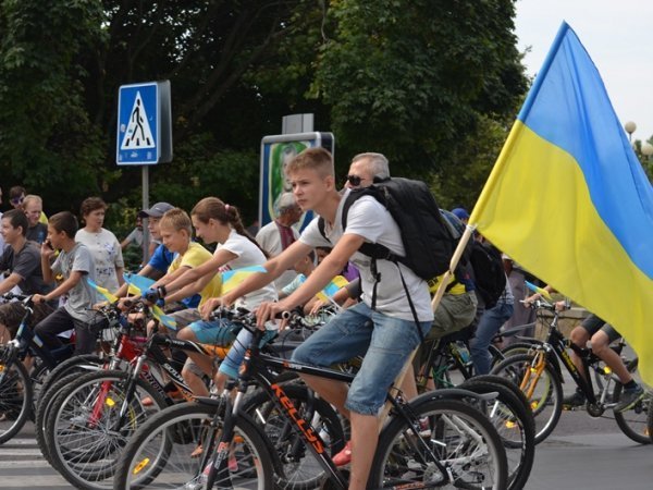 За проханням організаторів учасники велопробігу прикрасили свої велосипеди прапорами України — як символом державного свята.