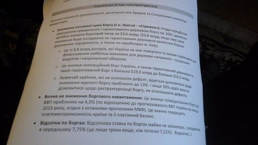 Напередодні американська газета The Wall Street Journal повідомила, що Україна і кредитори обговорюють варіант списання 20% основної суми боргу. А британська The Financial Times з посиланням на власні джерела зазначила, що Комітет кредиторів і влади України можуть домовитися про реструктуризацію єврооблігацій країни вже на поточному тижні.
