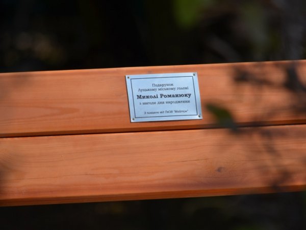 Лавочки іменні – на кожній вмонтована табличка на якій зазначено: «Подарунок Луцькому міському голові Миколі Романюку з днем народження. З повагою ТЗоВ «Майтім».