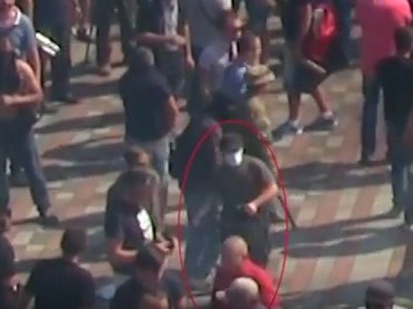Чоловік, зафіксований на відеозаписі, вдягнений у кепку, його лице приховане за медичною маскою. Момент вибуху знятий з двох ракурсів: з будівлі Верховної Ради та з площі перед парламентом.