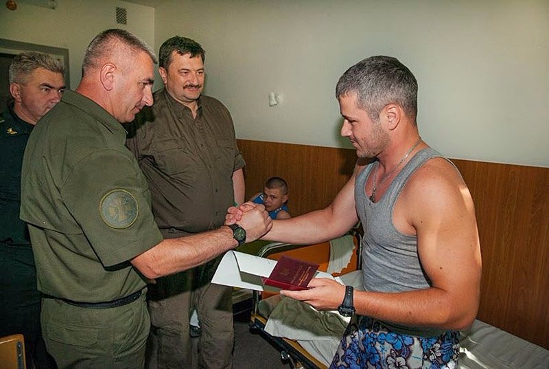 "Високими державними нагородами відзначено 15 воїнів Національної гвардії, серед яких троє нагороджено посмертно: орденом "За мужність" ІІІ ступеня відзначені старший солдат Ігор Дебрін, солдат Олександр Костин, солдат Дмитро Сластіков.