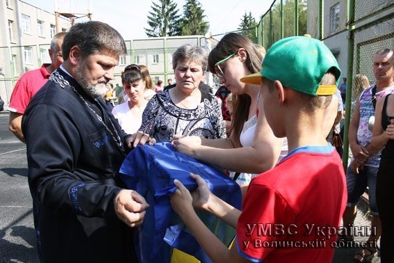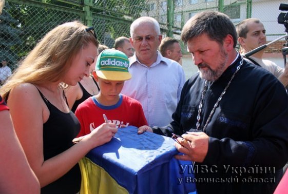 А настоятель луцького Свято-Михайлівського храму отець Степан подарував правоохоронцям жовто-блакитний стяг, на якому рідні власноруч написали найтепліші слова підтримки та свої побажання. Цей символічний оберіг дасть силу та витримки нашим бійцям у складних хвилинах перебування в АТО.