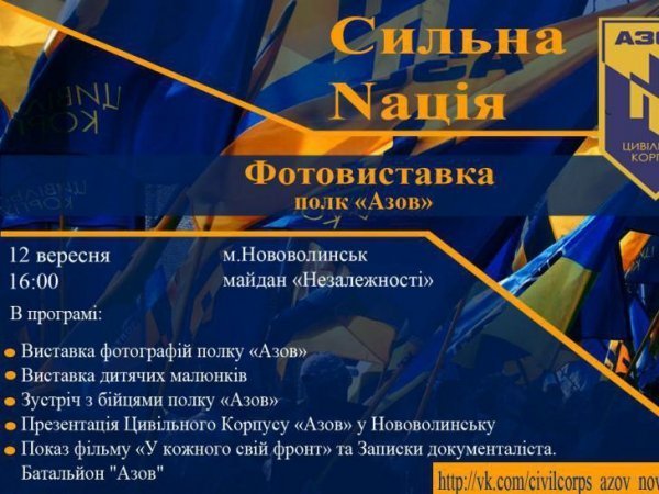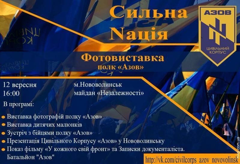 Також відбудеться презентація Цивільного Корпусу "Азов" нововолинцям та перегляд фільмів "У кожного свій фронт" та "Записки документаліста. Батальйон "Азов".