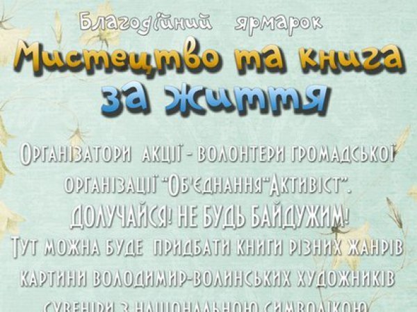 12-13 вересня у Володимирі-Волинському стартує перший благодійний ярмарок «Мистецтво та книга за життя».