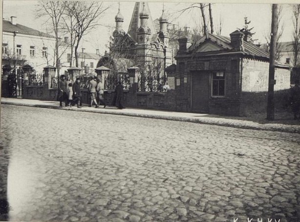 Забрукована вулиця Кафедральна. Видно, що проїзну частину відділили від тротуарів підвищенням. Біля цього підвищення виникає канавка для стікання води. Фото з Австрійської національної бібліотеки