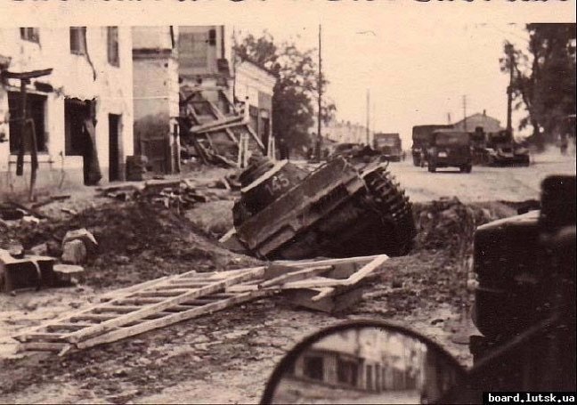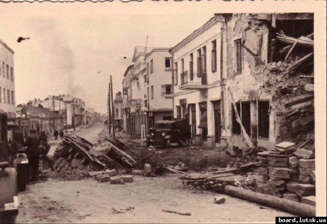 Після Другої світової війни епоха бруківок явно відійшла у минуле. У моді став асфальт. Він вимагав значно менше часу на укладання, що в умовах післявоєнної відбудови було дуже вагомим фактом. Асфальтувати Луцьк стали в 1940-і. Є один цікавий факт, який пов’язаний з вулицею Сталіна (після приходу в Луцьк совіти перейменували Ягеллонську на Сталіна). Під час проїзду вулицею в яму потрапив танк. Це місце було трохи вище перетину нинішніх Лесі Українки та Крилова. Сусідній будинок був розбомблений. В ньому, як і досі, була аптека. На фото видно вивернуту вибухом трилінку.