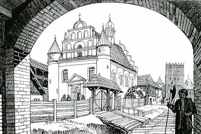 Вигляд на кафедральний костел святої Трійці у XVI столітті з-під Воротньої вежі Окольного замку. Справа унизу зображене типове мощення того часу. Реконструкція архітектора Ростислава Метельницького. Зображення з книги «Римо-католицькі святині Луцька»