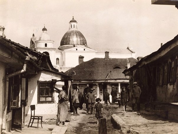 Одна з брудних вулиць міста - у єврейському кварталі Жидівщина. Суцільне болото між будівлями. По центру вдалині - костел Петра і Павла. Фото з приватної колекції