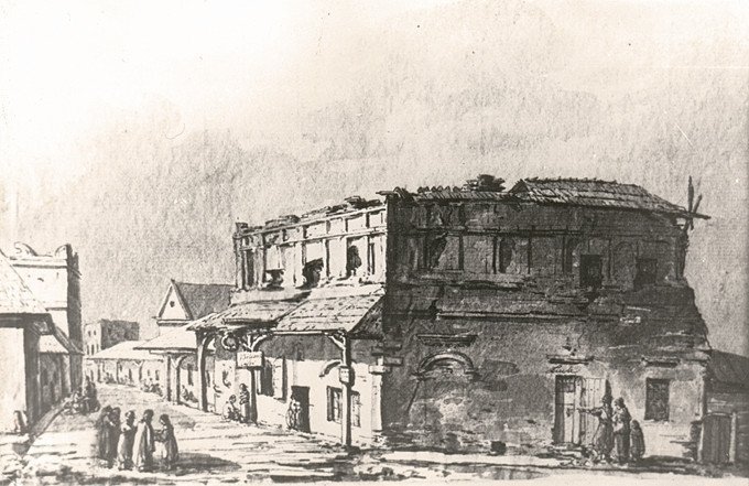 Характерний стан тодішніх вулиць і проходів міста. Між будинками - яма, в яку зливали нечистоти. Від вулиці до будинку прокладені дерев'яні дошки. Фото з цифрового архіву «Єврейське життя у Польщі» Науково-дослідного інституту мови їдиш