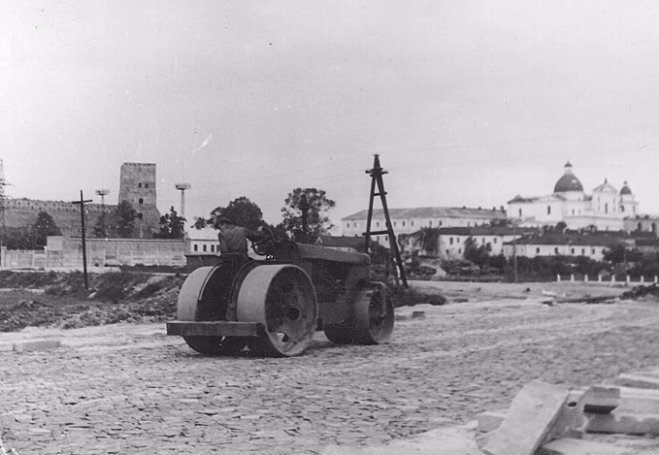 Брукарські роботи на нинішній вулиці Глушець у 1950-ті. Зображення з книги «Вулиці і майдани Луцька»
