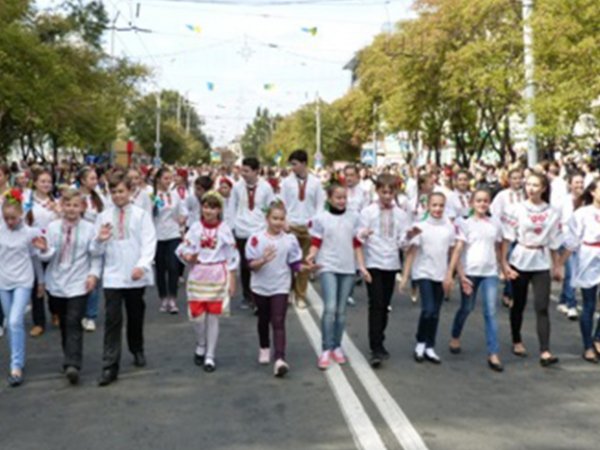 На День міста у центрі Маріуполя відбувся масштабний парад вишиванок. На початку було виконано державний гімн України.