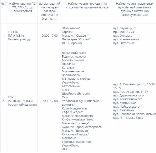 Детальну інформацію про планове припинення електропостачання дивіться у поданій таблиці: