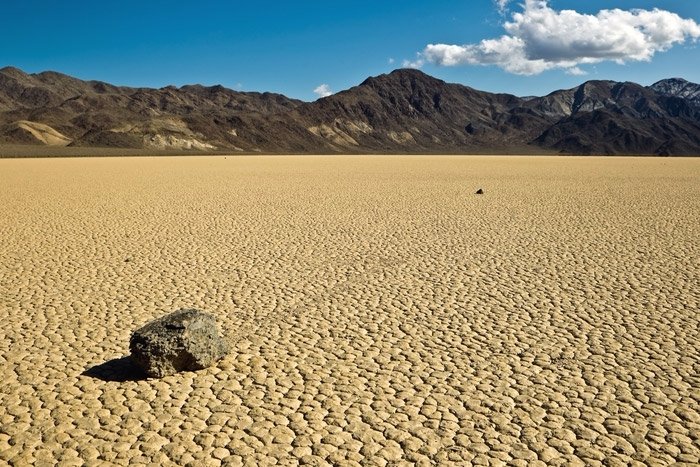Ви можете фактично ясно відрізнити їх сліди на поверхні пустелі. Поїздки цих “Каменів-Вітрильників” є великою геологічною таємницею і явищем, яке, як вважають, створено серйозними вітрами, швидкістю каменів, тонким шаром піску і багатьма іншими чинниками. Побувати в Рейстрак Плай – справжнє везіння, де Ви будете оточені драматичними гірськими вершинами, над якими домінують тільки безформні білі хмари.