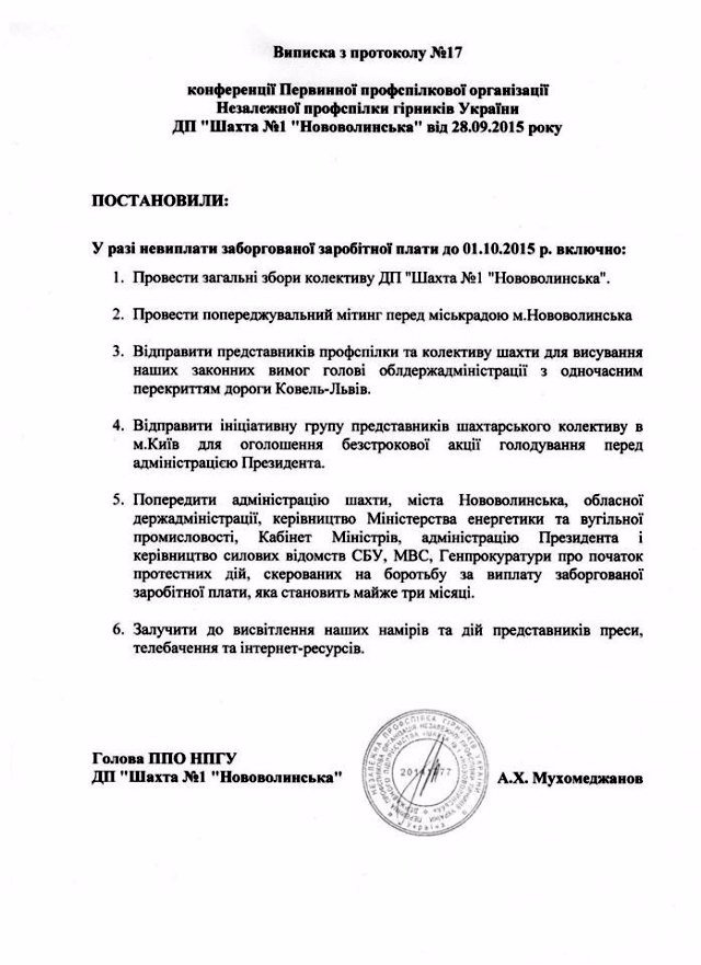 Окрім того, група шахтарів «Нововолинської №1» поїде в Київ на безстрокову акцію голодування перед Адміністрацією Президента.