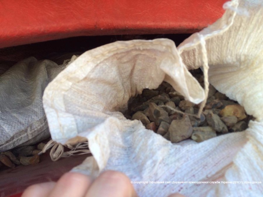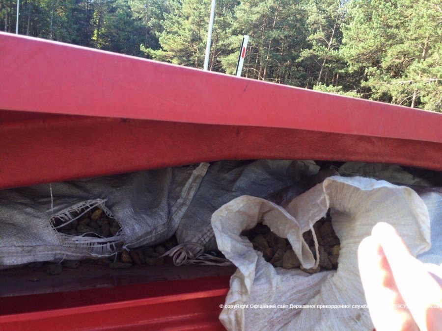 При проведенні додаткового огляду працівники пункту пропуску під спойлером на кабіні автомобіля виявили близько 100 кілограмів необробленого бурштину, що знаходився в 5 мішках.