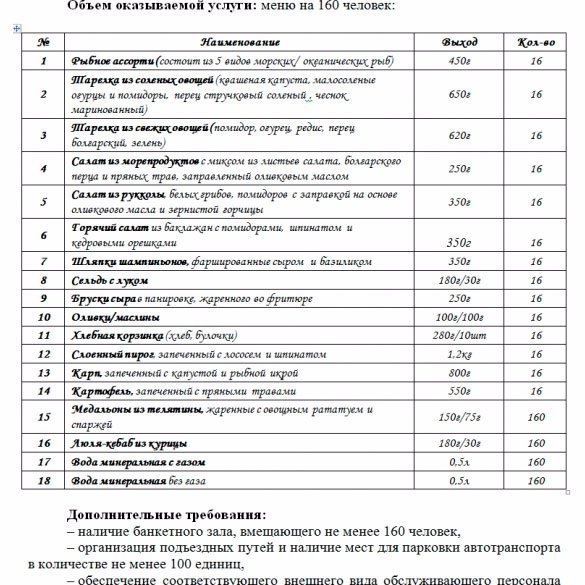 Там були розміщені звичайне і VIP-меню. Звичайне меню складали пиріжки з капустою, чай і кава, люля-кебаб з курки, смажена телятина тощо. До «багатшого» меню потрапили салати з морепродуктів, сирні тарілки, рибне і м'ясне асорті, червона ікра та морс з лісових ягід.