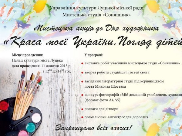 У неділю, 11 жовтня, у приміщенні Палацу культури міста Луцька відбудеться відкрита мистецька акція "Краса моєї України. Погляд дітей» з нагоди Дня художника.